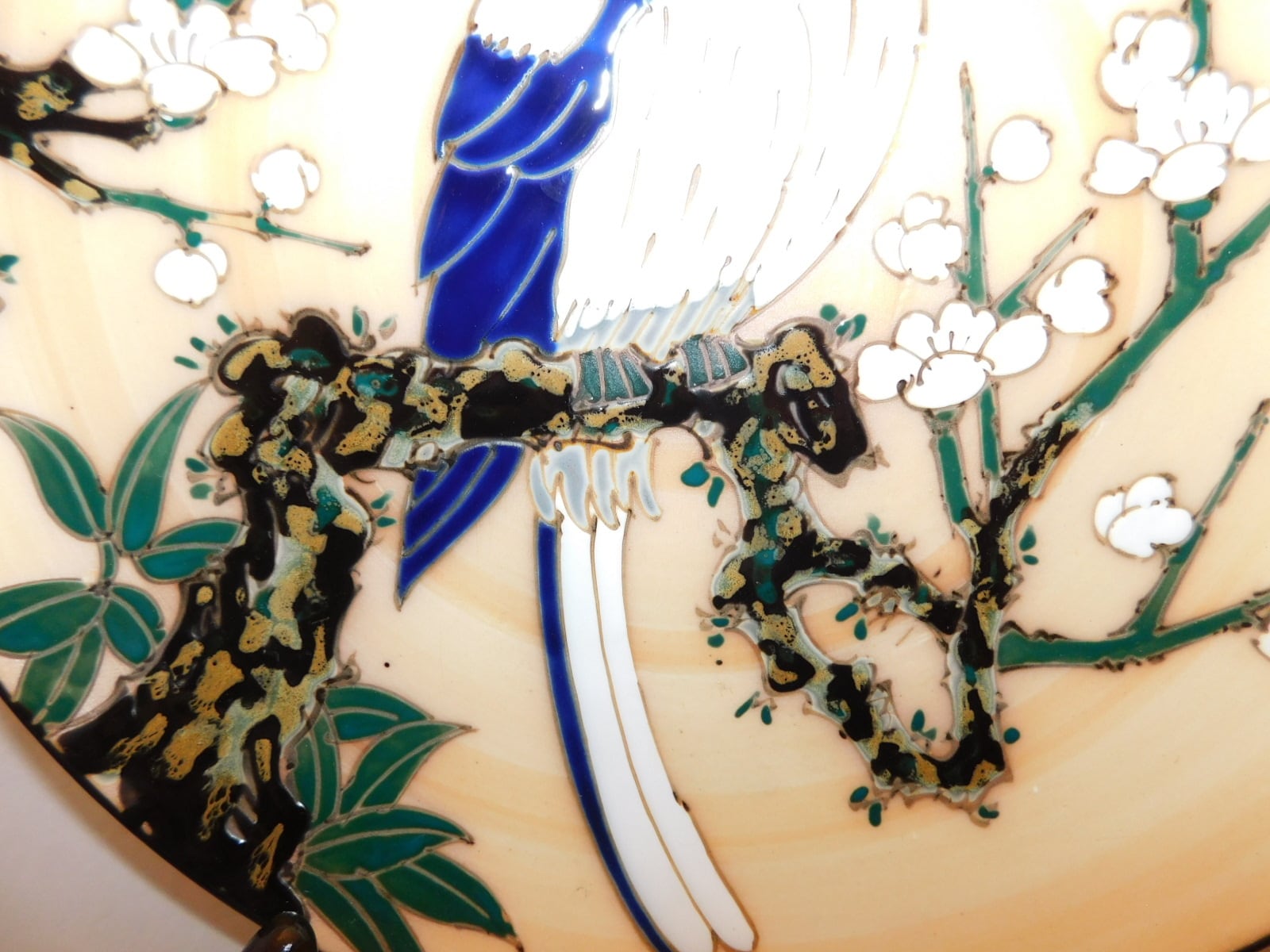 直径Φ36cm☓高さ4.5cm over 50~60 years old ~いっちゃん店主のコメント~ 梅に不如帰、陶磁器に七宝の細工です。 作家物で壁掛けにもなります。