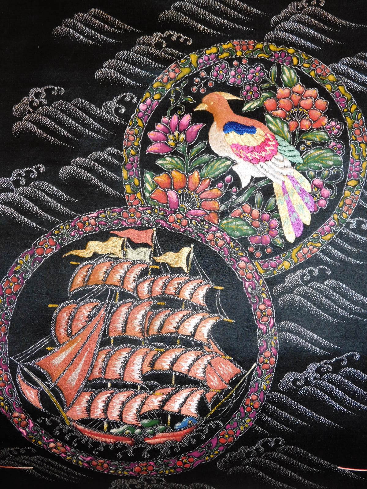 width 30cm☓length 約315m ~いっちゃん店主のコメント~ 黒の繻地に帆船&鳥の日本刺繍、未使用と思われます。