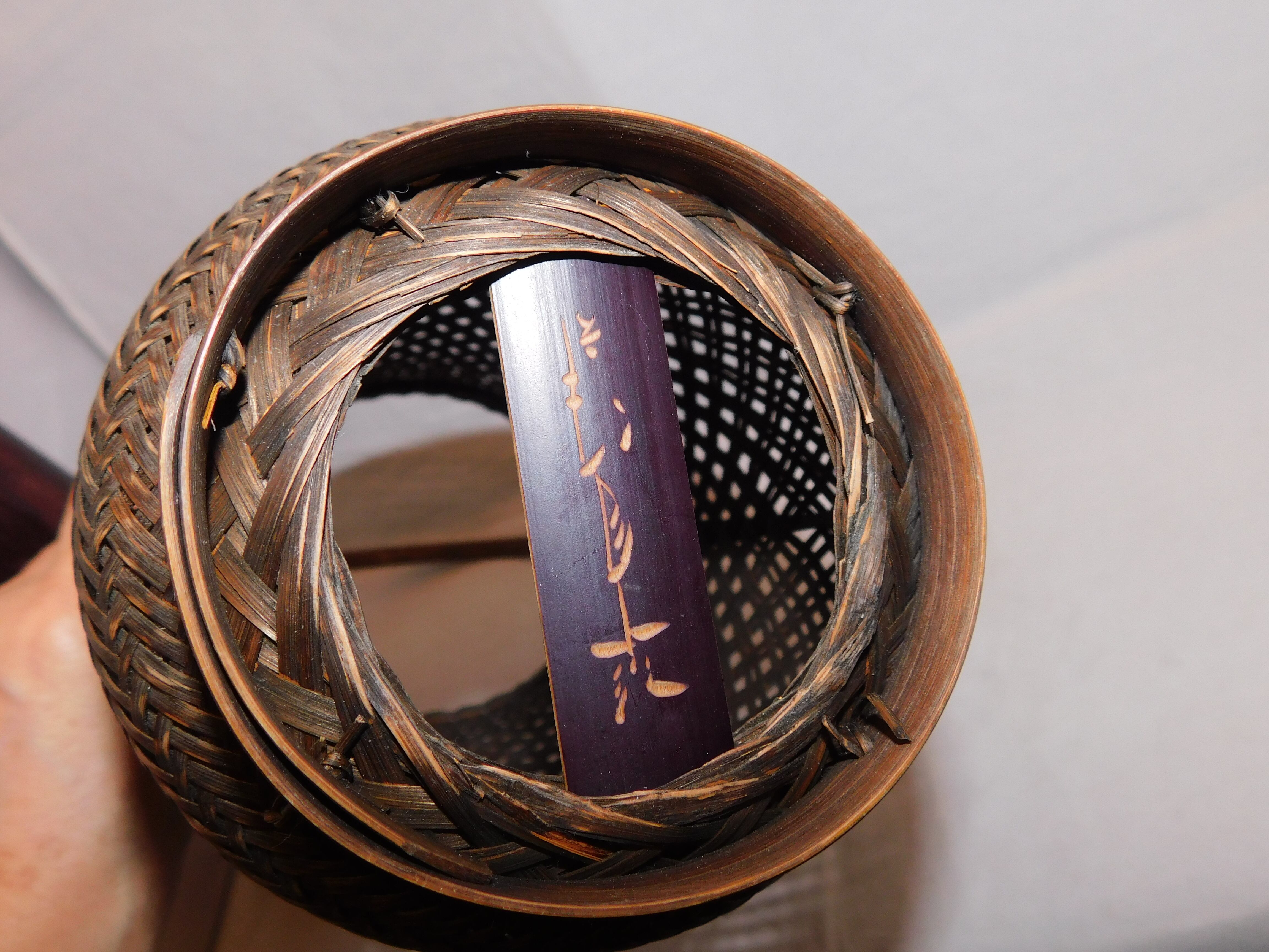 diameter直径Φ10cm☓width横12cm☓ length縦40.5m 手の部を含む ~いっちゃん店主のコメント~ 翠月 作 銘 有 丸みのある優しい花籠です