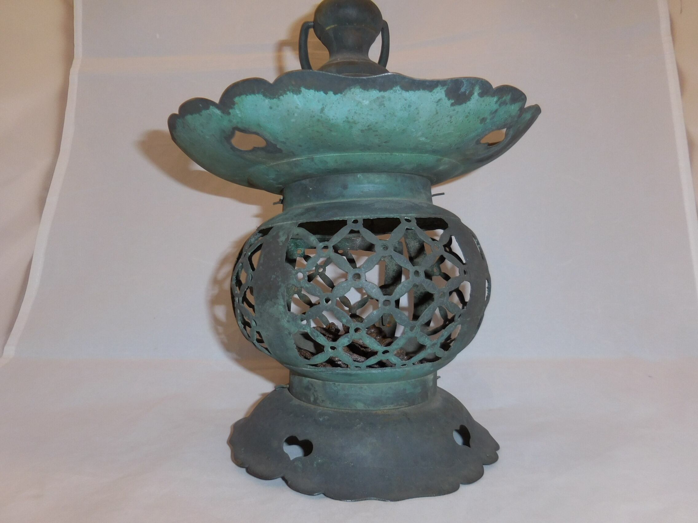 over 150~200 years old 直径Φ18.5cm☓縦25cm チェーン付き。 ~いっちゃん店主のコメント~ 江戸時代の釣灯籠
